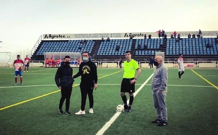 Y, acompañado del director del equipo, Miguel Villalobos, y del directivo pimentonero, Jesús Torres, Alejandro Collado realizó el saque de honor del partido que disputaron a continuación en el polideportivo municipal el Jaraíz y el Piornal.