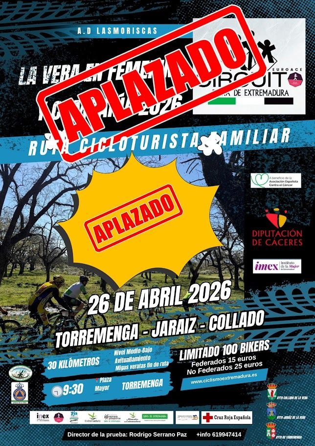 Sin embargo, este evento deportivo-solidario ha sido aplazado, ha informado la AD Las Moriscas, la entidad jaraiceña organizadora, conjuntamente con la Federación Extremeña de Ciclismo y la colaboración de los Ayuntamientos de Torremenga, Jaraíz y Collado; la Dirección General de Deportes de la Junta de Extremadura, Diputación de Cáceres, Cruz Roja, Protección Civil de Jaraíz, la AECC y varias casas comerciales de la villa jaraiceña.
