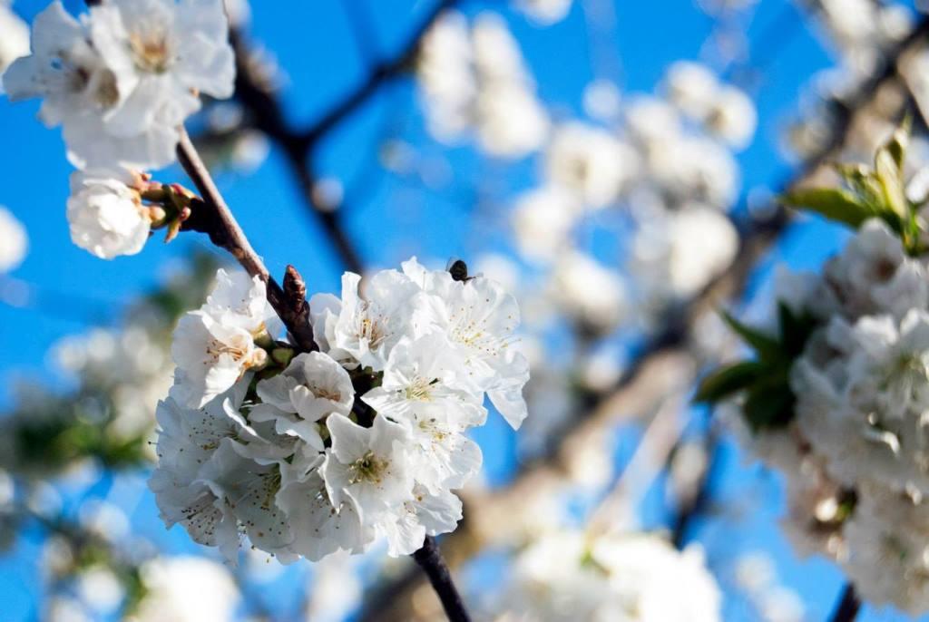 Los cerezos en flor lucen ya en La Vera Baja. El paisaje en La Vera Baja presenta una bella estampa blanca que contrasta con los verdes de los robles y el azul pétreo de Gredos. Su cultivo se ha expandido desde el Valle del Jerte.