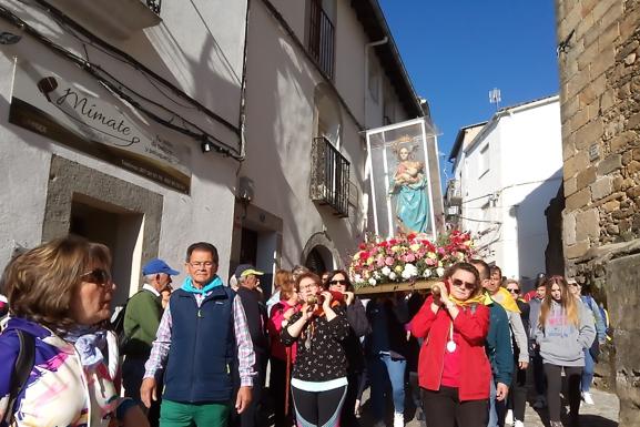 Lo han hecho llevando a hombros la Virgen del Salobrar. Concretamente a la imagen que se venera en la iglesia de Santa María, una réplica de la original. A pie, recorrerán unos diez kilómetros por la campiña jaraiceña, un tramo de la carretera Jaraíz-Navalmoral-Almaraz, y el resto, desde el polígono industrial, atravesando la dehesa boyal hasta la pequeña ermita de la romería.