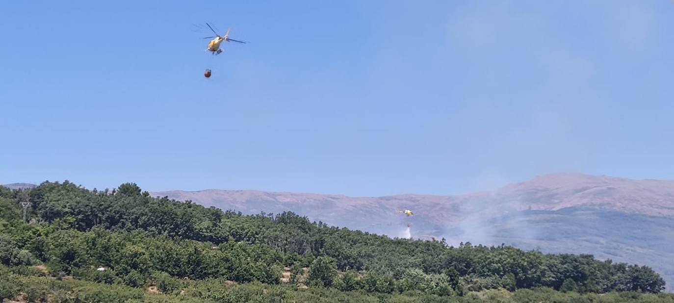 En la extinción están interviniendo medios aéreos (tres helicópteros) y terrestres del Plan Infoex, tanto de Jaraíz de la Vera como desplazados de la zona para sofocar las llamas.