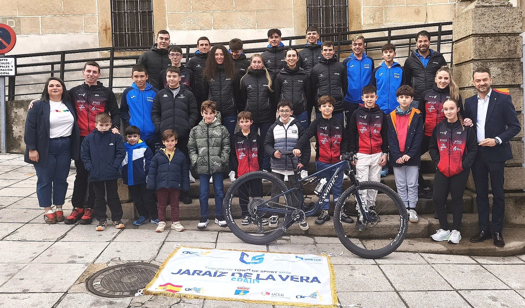Y en relación al acto de esta tarde, en la Plaza Mayor, han estado presentes el alcalde de Jaraíz de la Vera, Luis Miguel Núñez; así como la concejala de Deportes, Cintia Gómez. Para la foto de familia del equipo y demás asistentes se ha desplegado en el suelo la bandera que acredita a la localidad como 'Villa Europea del Deporte 2026'.