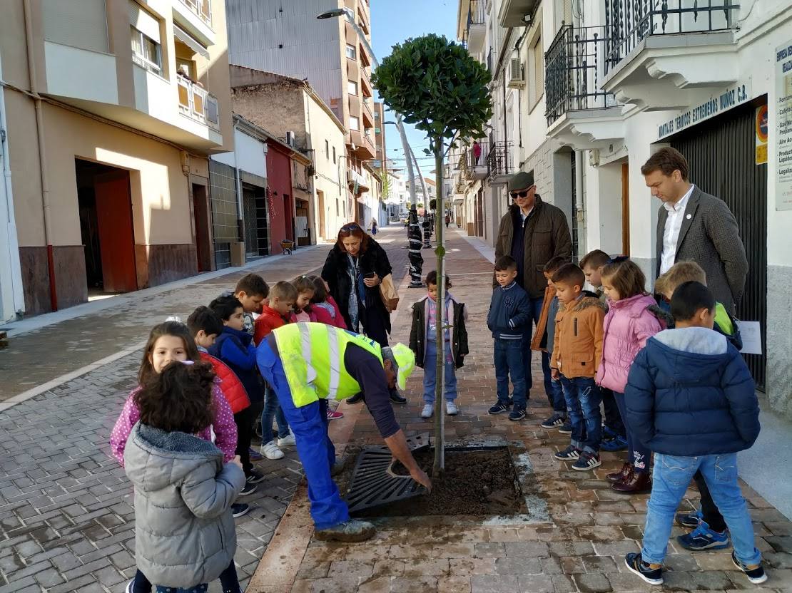 Los alumnos del colegio Gregoria Collado han plantado los nuevos árboles de ambos viales y probó el alumbrado