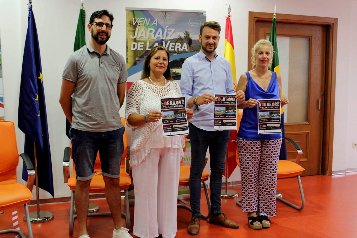 El salón de actos de la Casa Consistorial jaraiceña acogió ayer miércoles, por la mañana, la presentación del Festival Nacional de Folklore 'Villa Safariç 2022', que se celebrará el sábado, día 23 de julio, a las 22 horas, con entrada gratuita, en el polideportivo municipal.