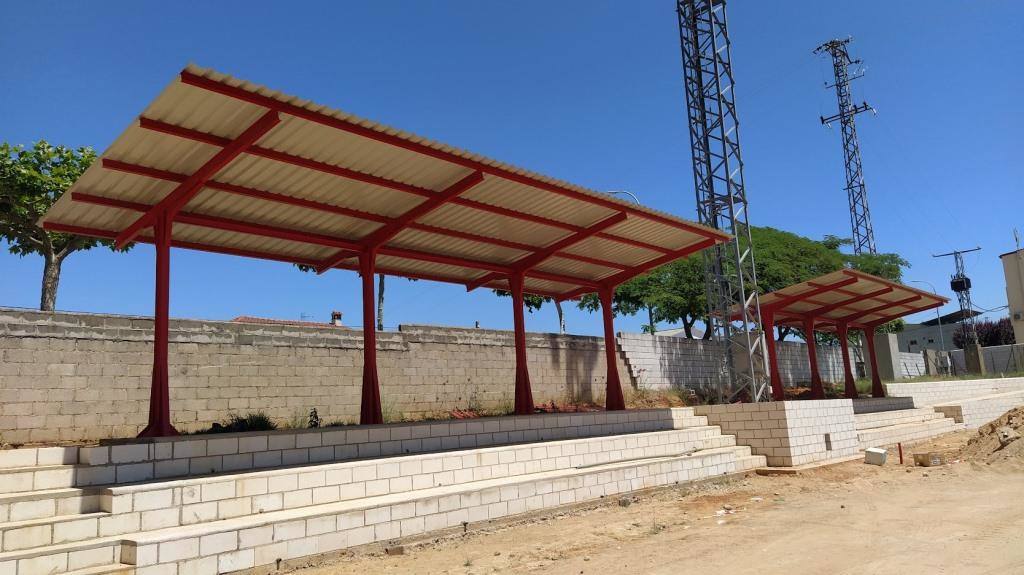 Este graderío se ha completado ahora con una cubierta. En realidad, se han hecho dos para sortear a una de las cuatro torretas del alumbrado del campo de fútbol, cada una con diez luminarias.