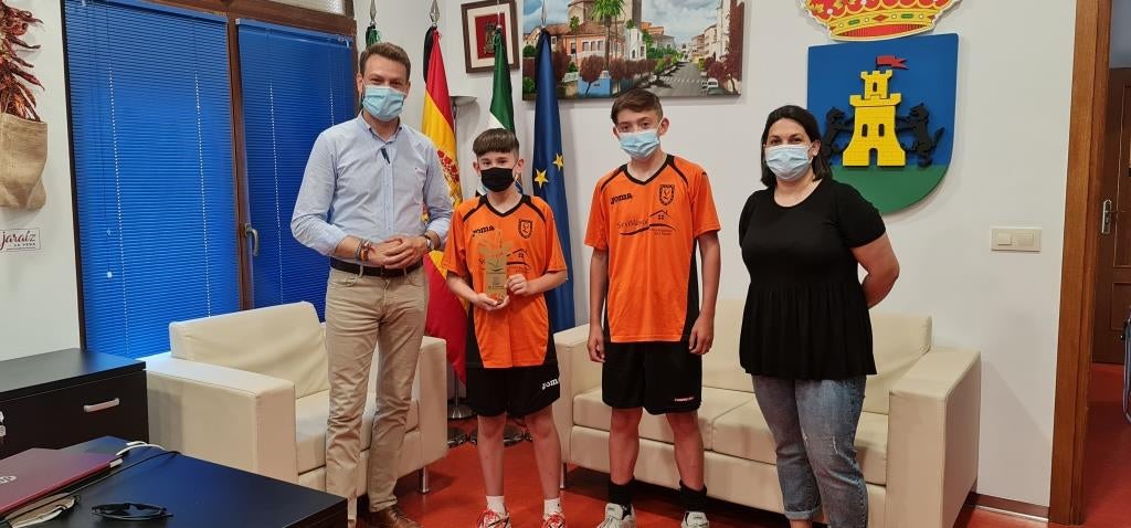 Unai Torés y Alejandro Jiménez han sido recibidos en el Ayuntamiento de Jaraíz de la Vera por el alcalde, Luis Miguel Núñez, y la concejala de Deportes, Cintia Gómez. Los dos jóvenes deportistas jaraiceños han mostrado el trofeo conquistado, al tiempo que han sido felicitados por los ediles en nombre de la Corporación Municipal y de la población.