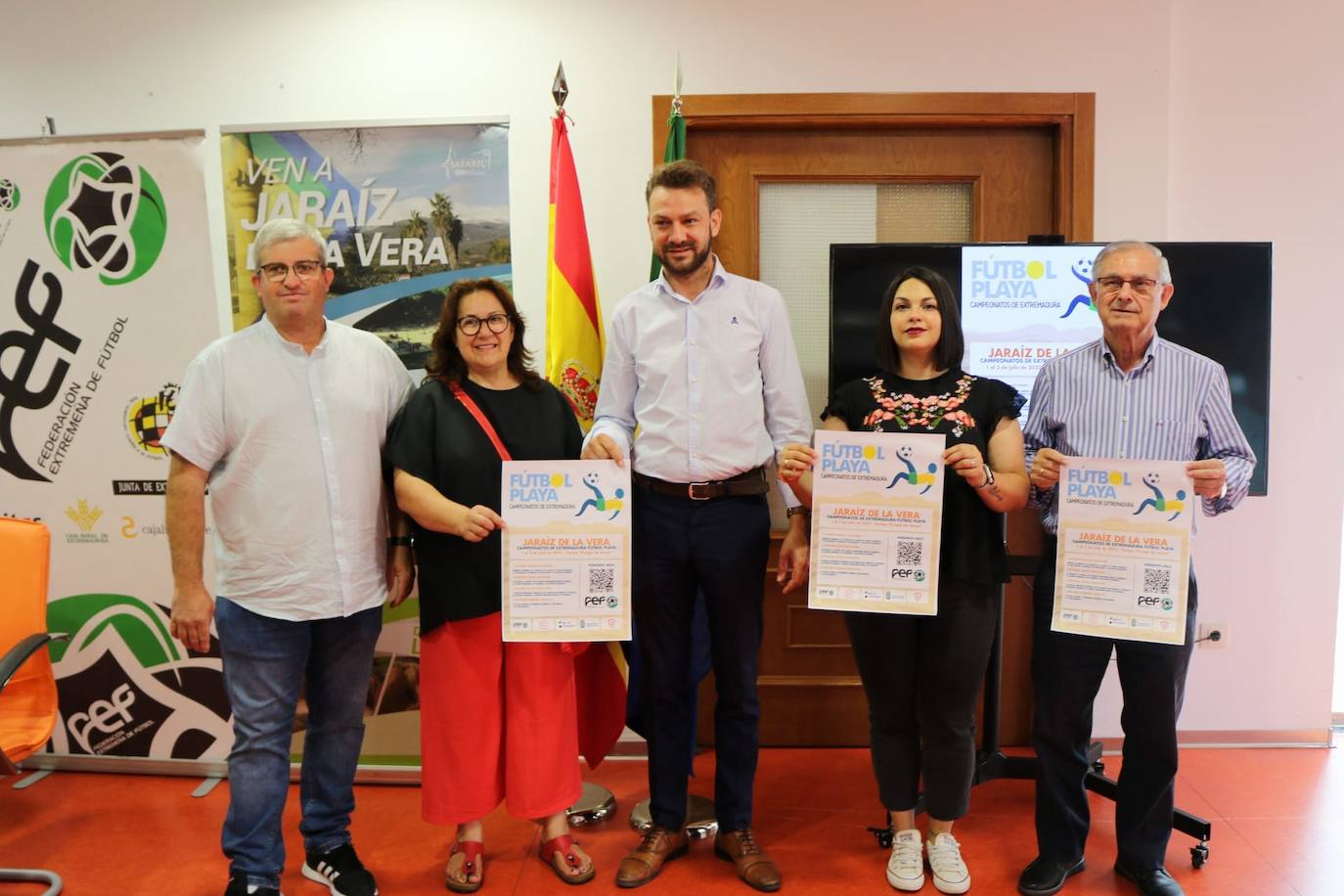 Este martes ha tenido lugar en el salón de plenos de la Casa Consistorial jaraiceña la presentación de este evento deportivo, que se disputará en el Lago del 1 al 3 de julio. Al acto han asistido el presidente del Comité de Fútbol Playa de la Federación Extremeña de Fútbol, José Javier Moreno; el delegado la zona norte de la Federación Extremeña de Fútbol, Félix García Martín; el alcalde de Jaraíz, Luis Miguel Núñez Romero; la concejala de Deportes, y Cintia Gómez Torres; y la presidenta del CF Jaraíz, Ana Isabel Paniagua Méndez.