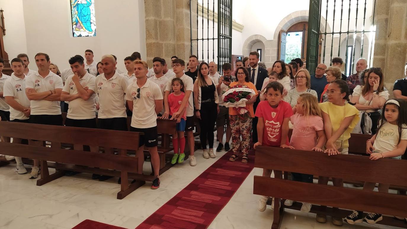 Después, autoridades y el equipo pimentonero se trasladaron a la ermita de la Patrona para realizar una ofrenda a la Virgen del Salobrar, a la que siempre se encomiendan antes de cada partido y rezan. Esta vez lo hicieron delante de la imagen.