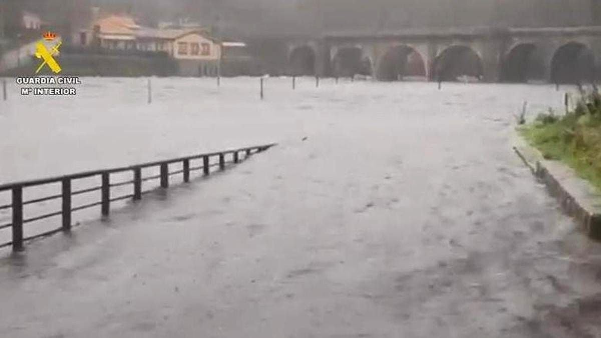 La Guardia Civil mantiene una vigilancia permanente de la situación meteorológica. En las imágenes el río Tiétar, en la comarca de la Vera, ante el aumento del caudal y la acumulación de agua en distintos puntos de la comarca.