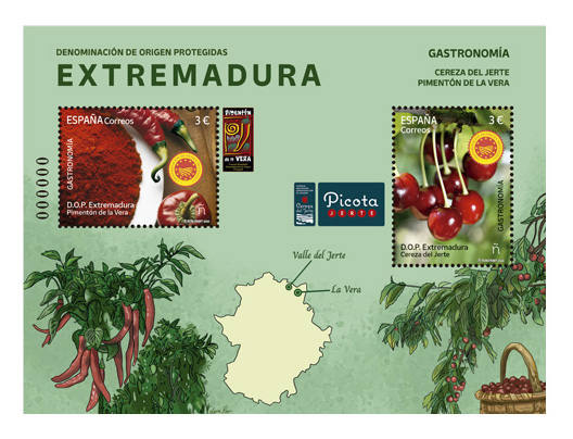 Este martes, 12 de marzo, el Ministerio de Transportes y Movilidad Sostenible ha publicado en el Boletín Oficial del Estado (BOE) que el día 25 de marzo de 2024 se emitirá una Hoja bloque con dos sellos de correo de la serie 'Gastronomía. DOP Extremadura' dedicados a la Cereza del Jerte y al Pimentón de la Vera.
