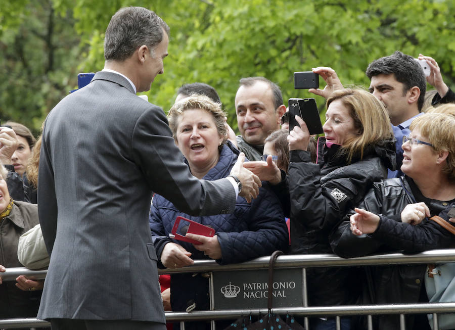 Don Felipe llegó 25 minutos tarde al acto. El helicóptero en el que viajaba desde Madrid no pudo tomar tierra donde estaba previsto debido a la abundante lluvia que caía en Cuacos de Yuste.