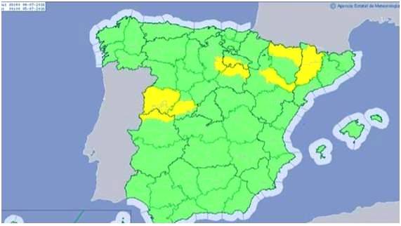 Huesca, Ávila, Burgos, Salamanca, Soria, Lleida, Cáceres y La Rioja están en situación de alerta por tormentas y Zaragoza y Lleida por temperaturas altas que podrían alcanzar los 36 grados.
