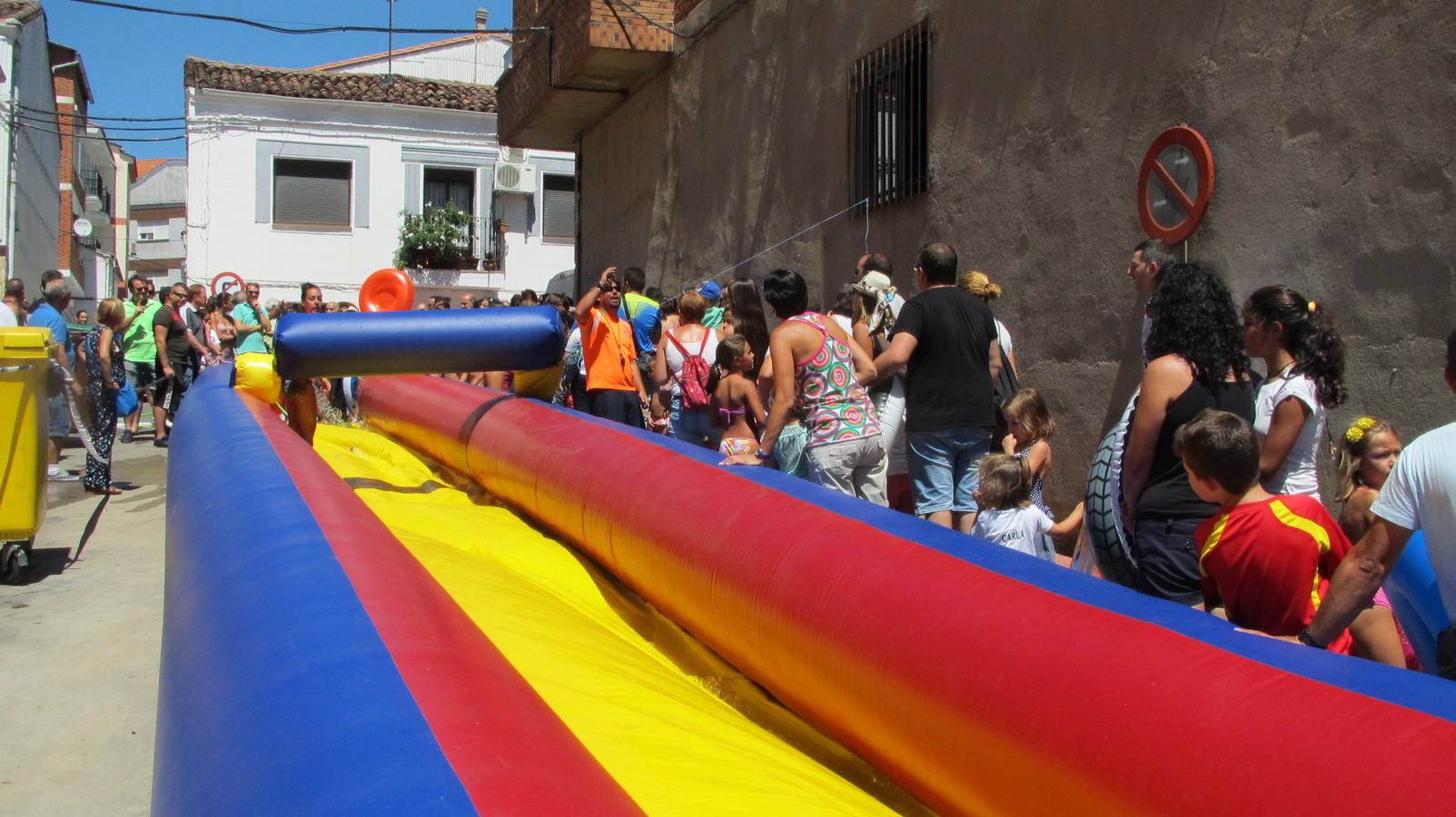 Hoy, al término de los toros matinales, en la calle Sevilla, los niños han podido disfrutar de actividades acuáticas, con una gran resbaladera, a los que se ha provisto de flotadores.