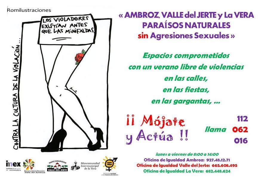 La Mancomunidad Intermunicipal de la Vera y las del Valle del Jerte y del Ambroz, a través de sus oficinas de igualdad, han puesto en ... marcha la campaña 'Ambroz, Valle del Jerte y La Vera, paraísos naturales sin agresiones sexuales', con dibujos de Noelia Páez.
