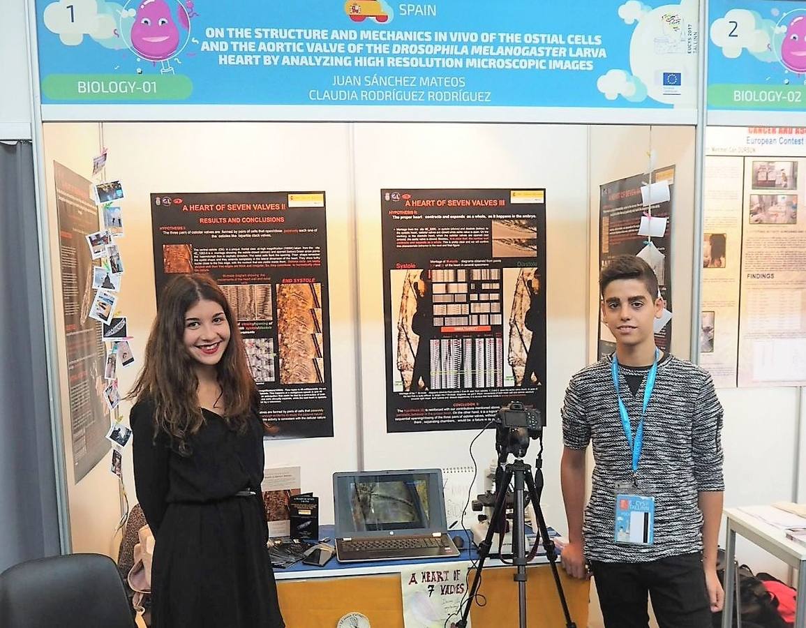 Los jóvenes investigadores Claudia Rodríguez Rodríguez y Juan Sánchez Mateos, del IES Maestro Gonzalo Korreas, de Jaraíz de la Vera, asisten a este certamen para dar a conocer su proyecto, premiado en la fase nacional, acerca de la Drosophila melanogaster.