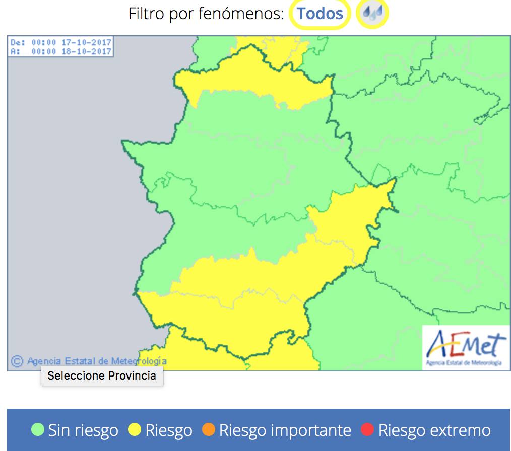 El aviso amarillo se mantiene activo desde las 6.00 horas del martes, 17 de octubre, hasta las 00.00 horas en la provincia de Cáceres donde se puede alcanzar los 40 litros por metro cuadrado en 12 horas. En la provincia de Badajoz, se activará a las 13.00 horas y terminará a las 21.00 horas en el que se estima que se recojan 15 litros por metro cuadrado en una hora.