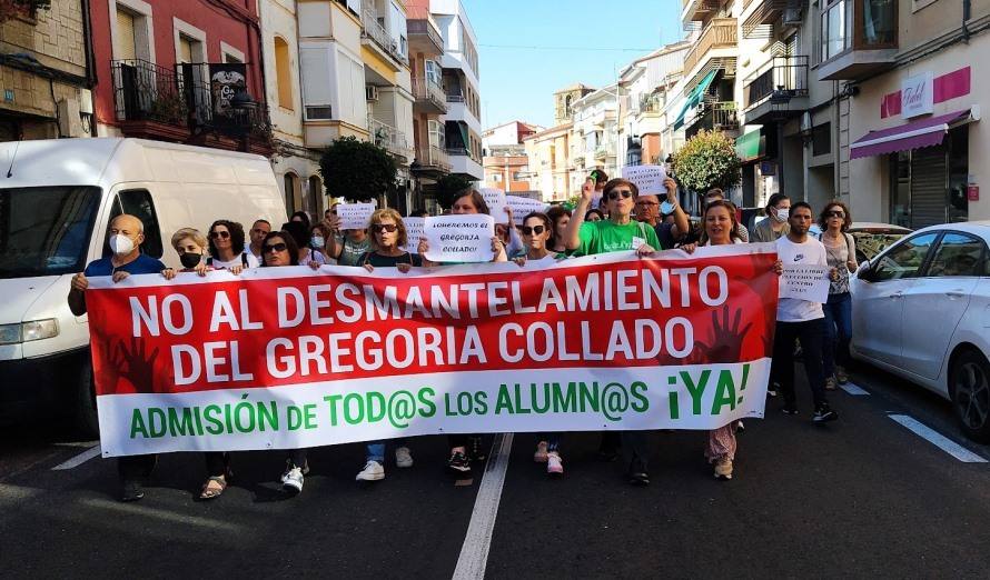 Los manifestantes abrieron la protesta con una pancarta con el lema 'No al desmantelamiento del Gregoria Collado. Admisión de todos los alumnos', que se ha convertido en el emblema de las reivindicaciones que están llevando a cabo los padres de alumnos, quienes, en la Plaza Mayor, leyeron un comunicado, a la vez que anunciaron que convocarán otra manifestación, pero por la tarde para que se sume más gente.
