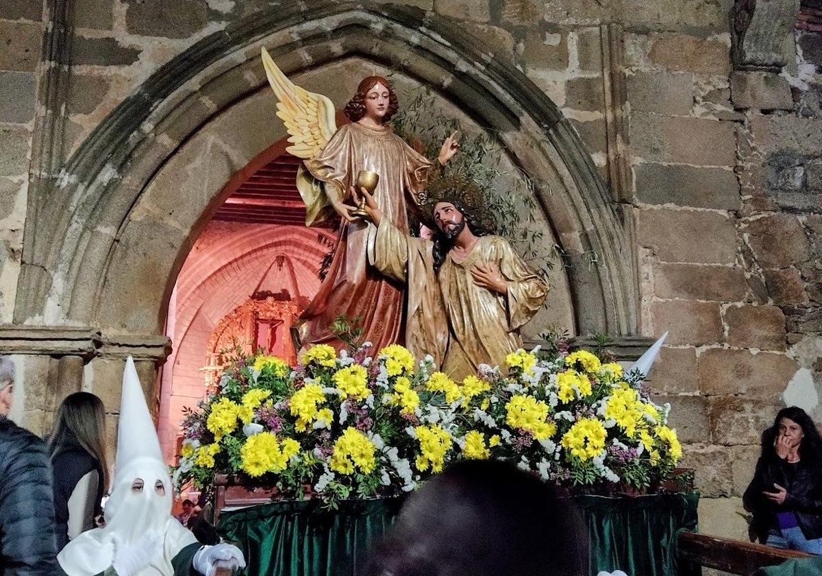 Partirá de la iglesia de Santa Marí, con los pasos de la Oración en el Huerto, El Amarrado, La Verónica y el Nazareno, una imagen vestida, que se dirigirán por Crucera, Pedreros y Cuatros Esquinas, en donde se unirán, procedentes de la iglesia de San Miguel, el Cristo de la Humildad, que se situará detrás de la Oración en el Huerto, y el Cristo del Perdón, que cerrará el cortejo, encaminándose hacia la iglesia de Santa María por Pedro Porcel, Vargas, Plaza Mayor, Damas, Agua, Jaime de Jaraíz y Crucera, punto en el que las imágenes de San Miguel continuarán hasta su templo por Pedreros y Fleming.