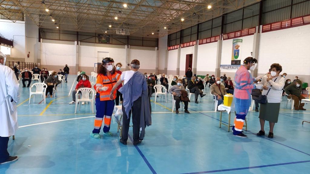En unos casos para recibir la primera dosis y en otros la segunda. Las personas dependientes lo han hecho en el campo de fútbol, en sus vehículos, sin bajarse. Y las que pueden caminar, la mayoría, en el pabellón de deportes.