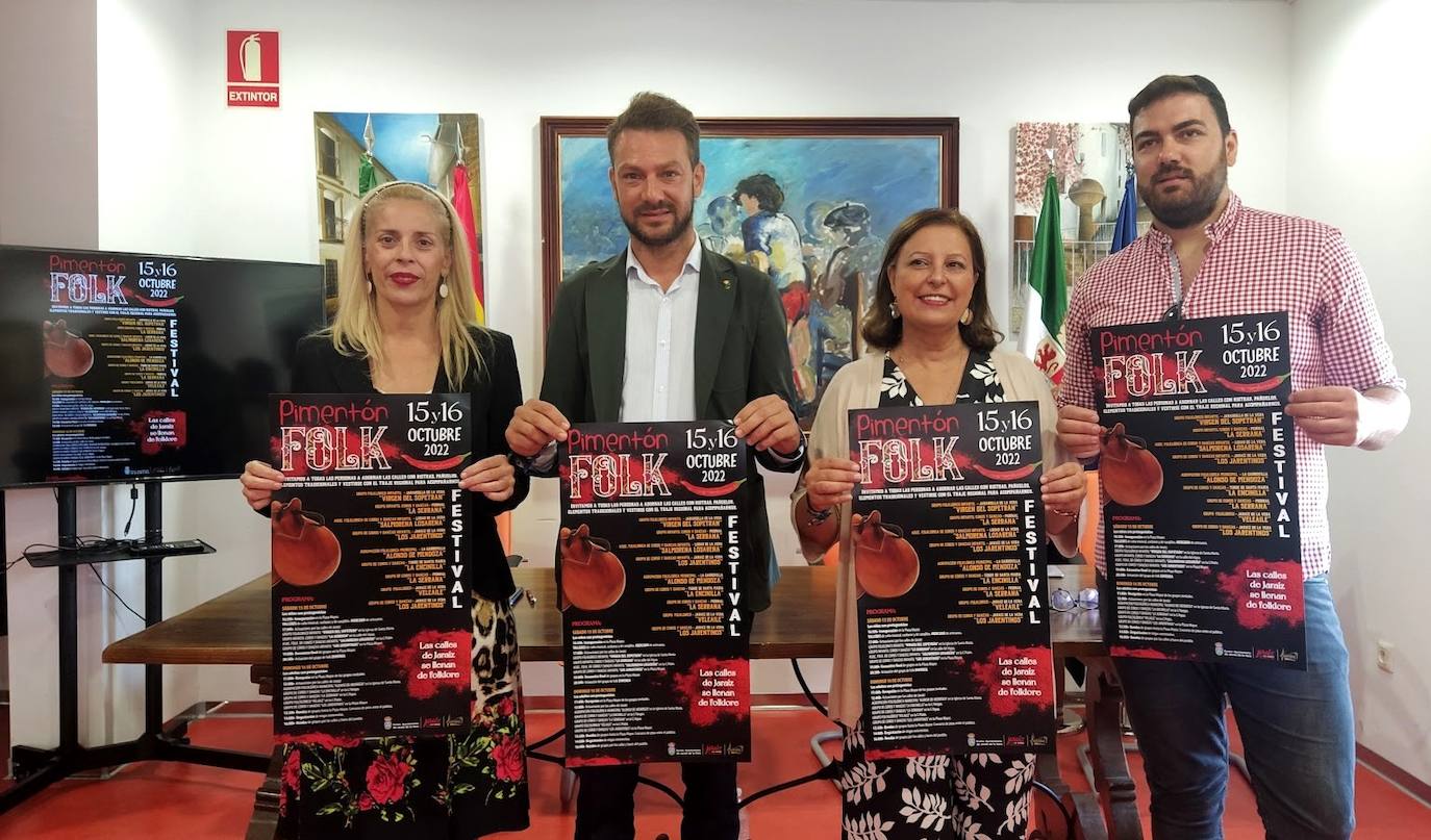 Este mediodía se ha presentado en el salón de plenos del Ayuntamiento de Jaraíz de la Vera la segunda edición de 'Pimentón Folk' por parte del alcalde, Luis Miguel Núñez; la concejala de Cultura, Montserrat López; y varios representantes de los Coros y Danzas 'Los Jarentinos', que se celebrará los días 15 y 16 de octubre.